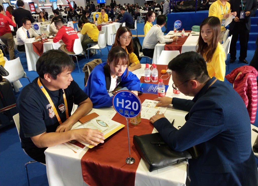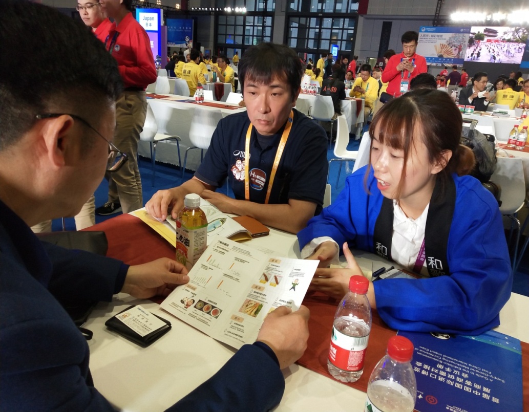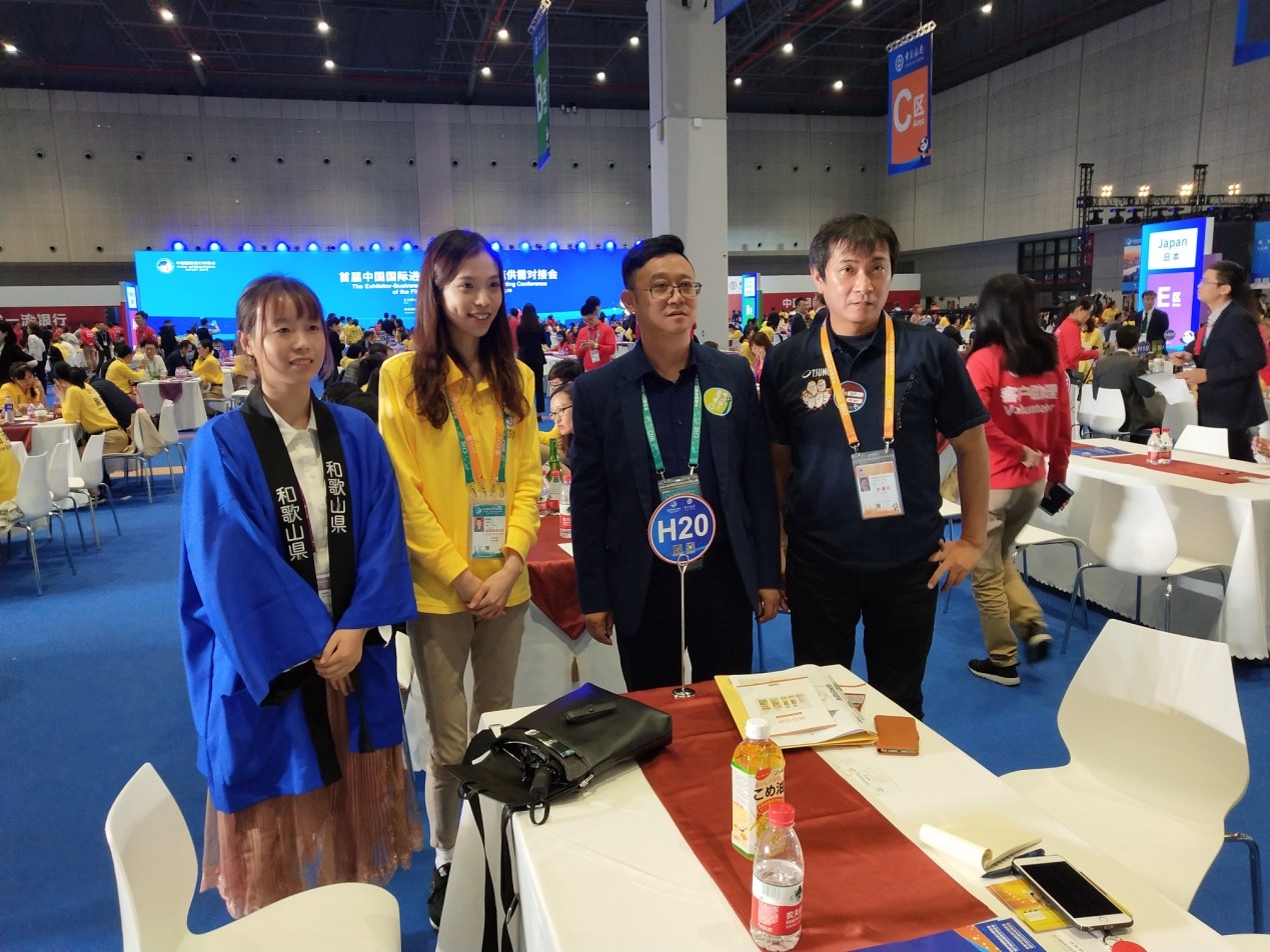 与日本参展商进行交流并进行合影留念